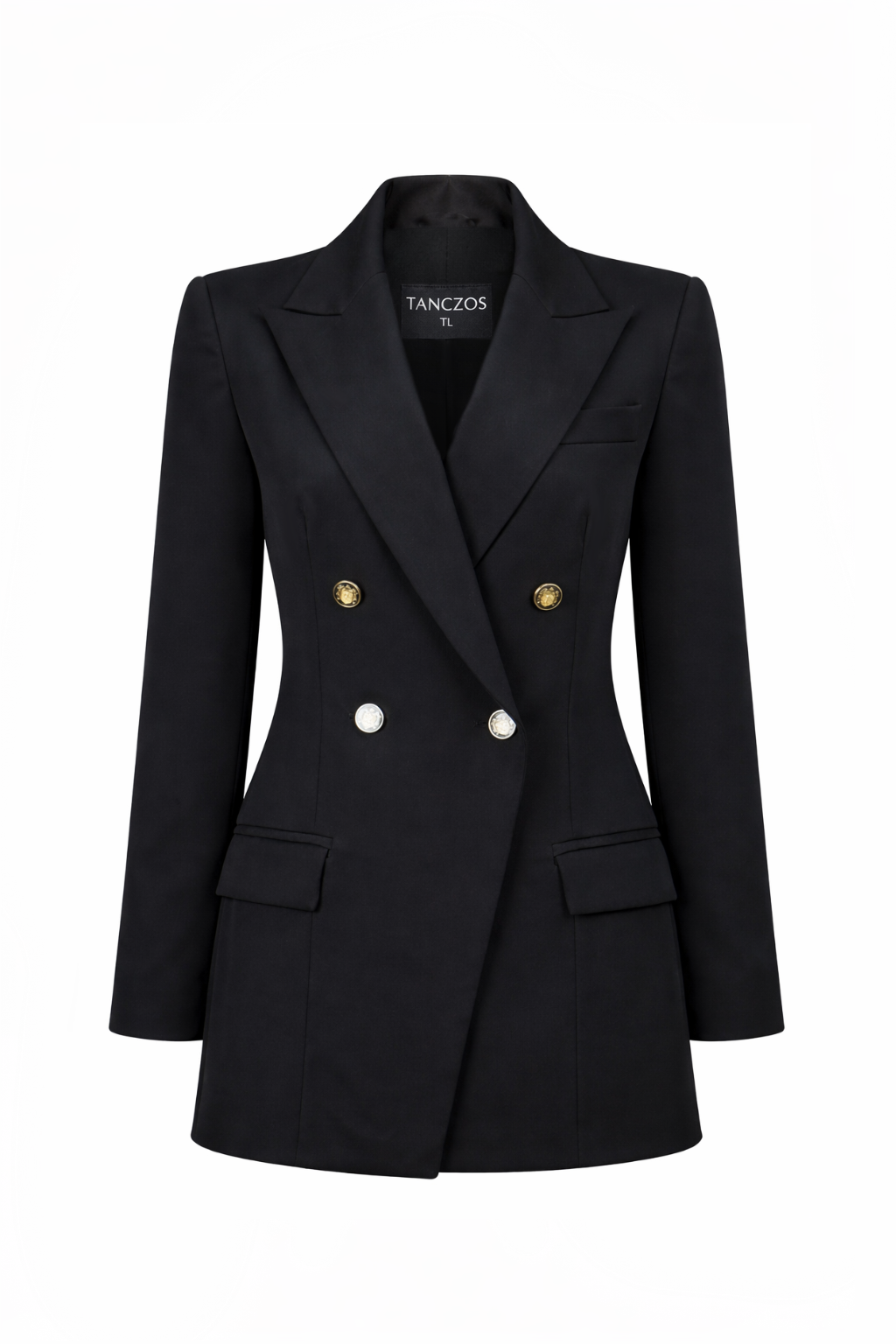 Klasszikus forma, férfias szabású arányok: a vonalak kontrasztja és a szép térfogat miatt a blézer tökéletesen kiemeli a női alakot. Kétsoros hosszított blézer könnyű szövetből, elülső füles zsebekkel és bal felső díszzsebkendő tartó zsebbel. Csúcshajtóka jellemzi.