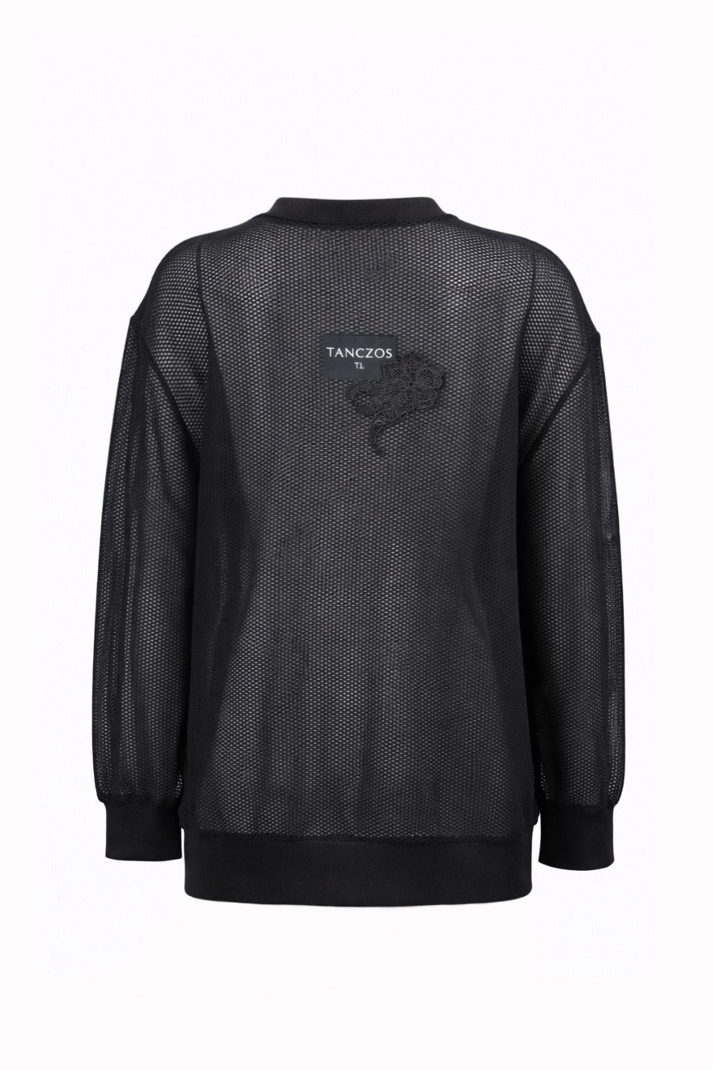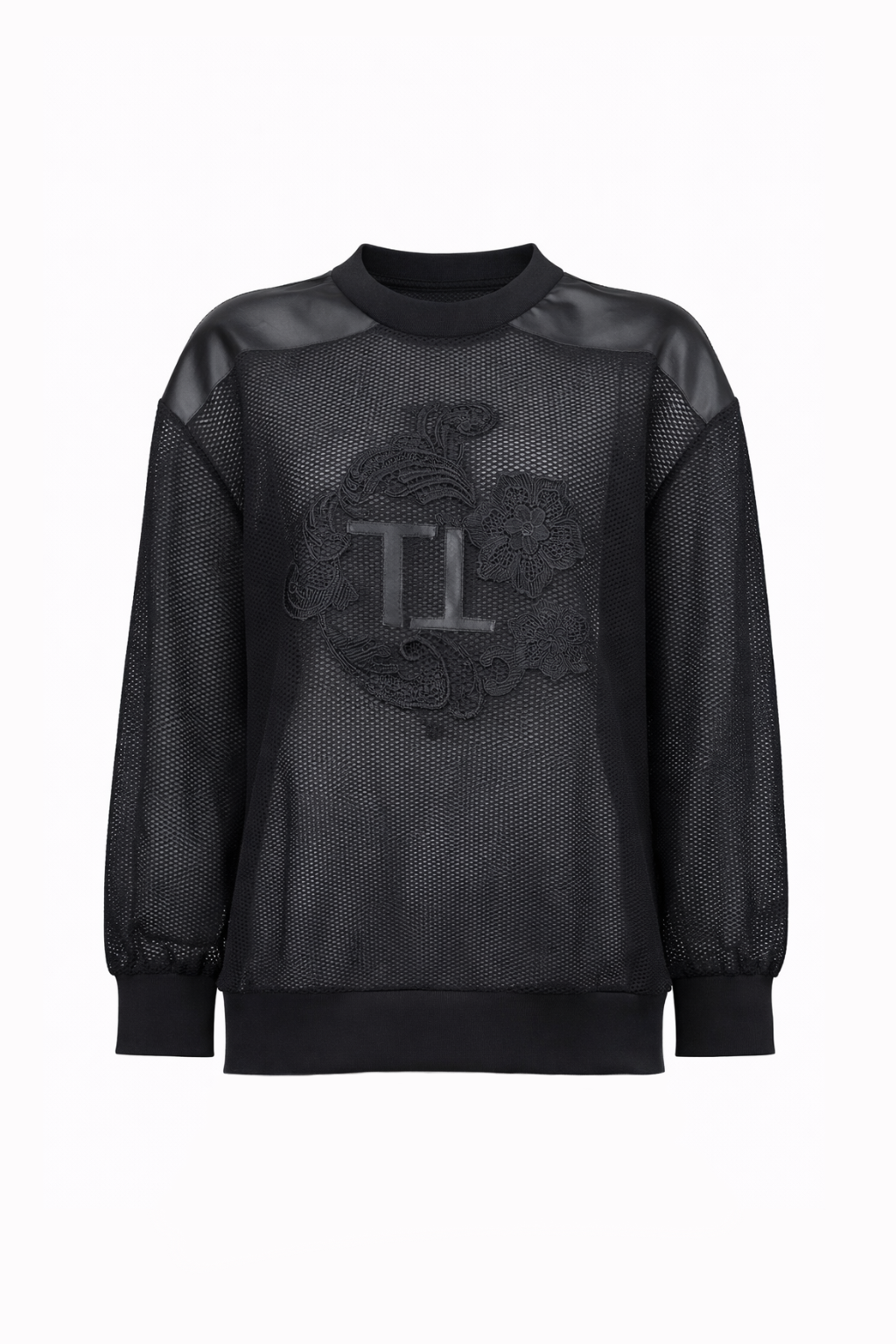 Laza szabású, sportos pulóver hálós textúrájú anyagból. A mellrészen elhelyezett TT monogram és pamutcsipke applikáció különleges karaktert ad a darabnak. Bőrhatású vállrész és bordázott passzé teszi modernné a megjelenést.