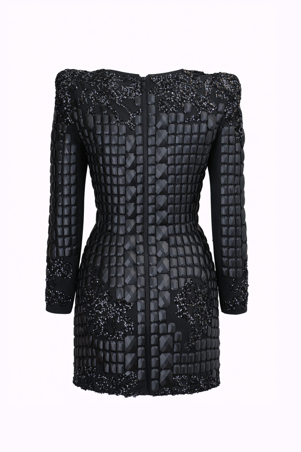 Strukturált szabású mini ruha gazdagon applikált, geometrikus díszítéssel. A formázott sziluett kiemeli a nőies alakot, míg a hosszú ujjak és a finom gyöngyös részletek couture hangulatot adnak a darabnak.