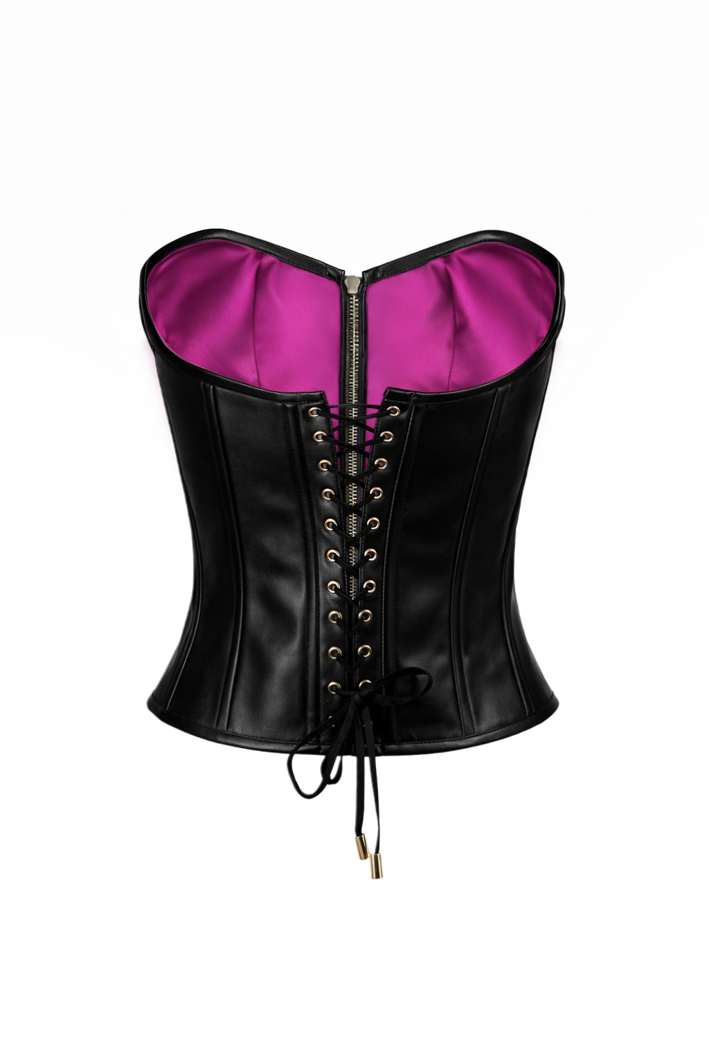 Karakteres, testre simuló műbőr fűző, amely hangsúlyosan formálja a derekat és a felsőtestet. Az elöl elhelyezett cipzár modern, határozott megjelenést ad, míg a hátul fűzős kialakítás lehetővé teszi az egyéni méretre állítást. Erős, mégis nőies darab, amely önmagában vagy rétegezve is statement hatást kelt.